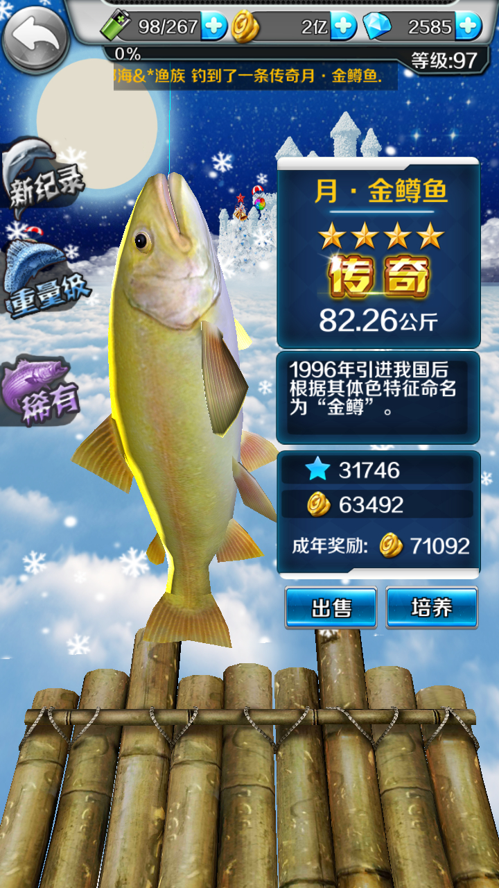 本人97级(线长+97,非常关键之数字),用+30海王套、王者线、猴线、及伤害、怒气糖果,至今已钓起全14种霸王,其中噬人鲨、鲤鱼、蝙蝠鱼、王后、金鳟、天**这6种已是传奇。