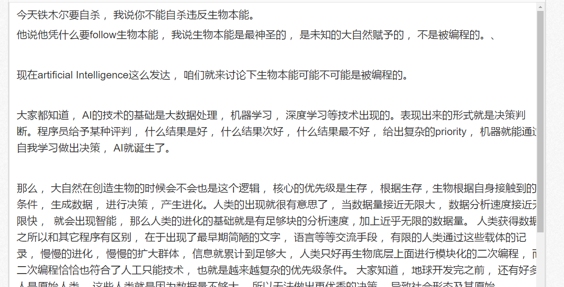 二,你一定要说洗脑了,我仔细想了一下,是可能存在这样的模型,比如某些个体为了优化或者巩固自己的生存,编造出一些意义去诓骗别人。但这儿的问题是,动机可以用本能来解释,过程也可以么,那么是谁提供了第一次经验呢?被洗脑者的反馈机制是怎么样的?(里面问题多的很,不一一列举,大概率有问题。)