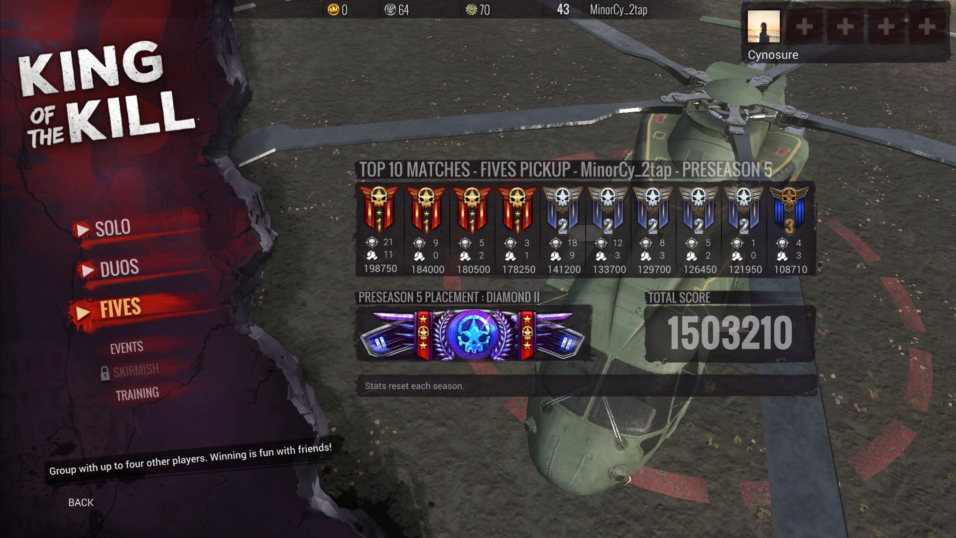 刚开始我还忍着,一句话都不说,随他,他还带了个超级萌新,一直怂恿我们3个人,一起躲一个房间,我真的不想跟他BB,也不想说话,就一直一起苟。苟到前10左右。