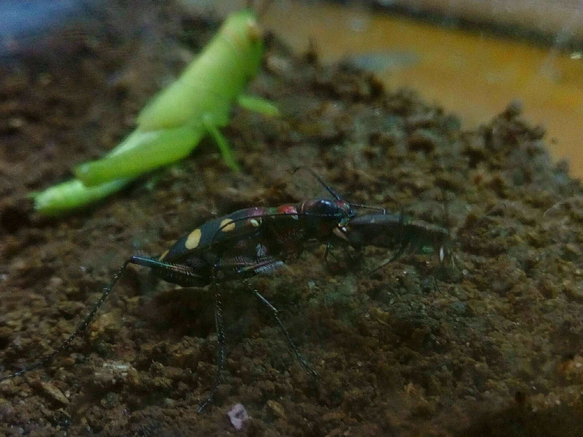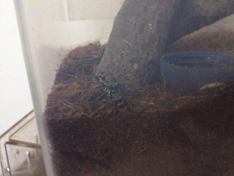 上次中华虎甲母虫死后一直没收到母虫。所以就用金斑虎甲看看能不能配上,结果是可以的。饲养盒里还有一只公金斑和另一只母金斑交配。昨天晚上小的那只母虫死了。开始以为母虫产卵死掉后被面包虫啃的。但是今天下午中华虎甲和大的那只母虫在交配,晚上就成这样了。和之前的一样鞘翅打开,躯体掏空。难道虎甲还有奸 杀的行为?