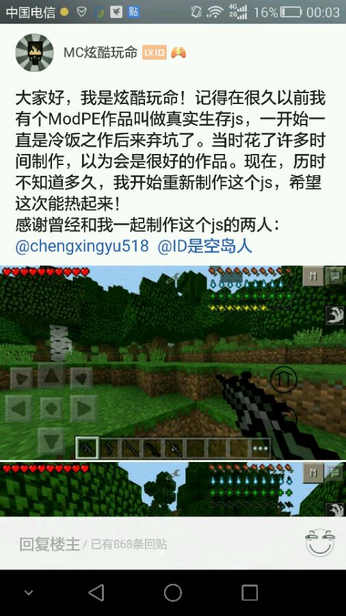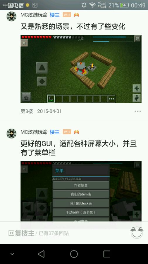这个是我第一个自我感觉不错的js,当时已经能熟练编写simpleGUI,以及一些实体算法,我记得当时还有个家伙把我的这个盗过去修改了发布,这个人就不提了,我记得这个伙伴能自动种植,跟着Steve走,打怪,在亮度低于7的地面插火把,总之很有意思