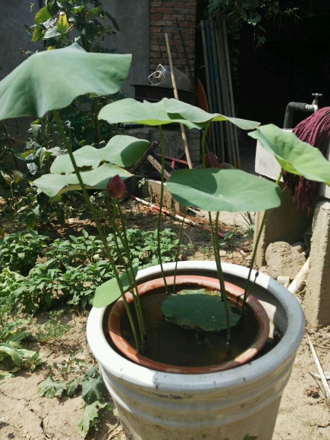 送人的一盆!他们怕太阳大,放在树荫下!我今天搬到了太阳底下!三个花蕾!估计是红色复瓣!就是茎太高!