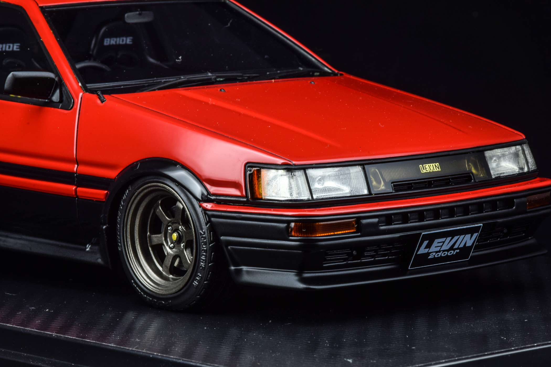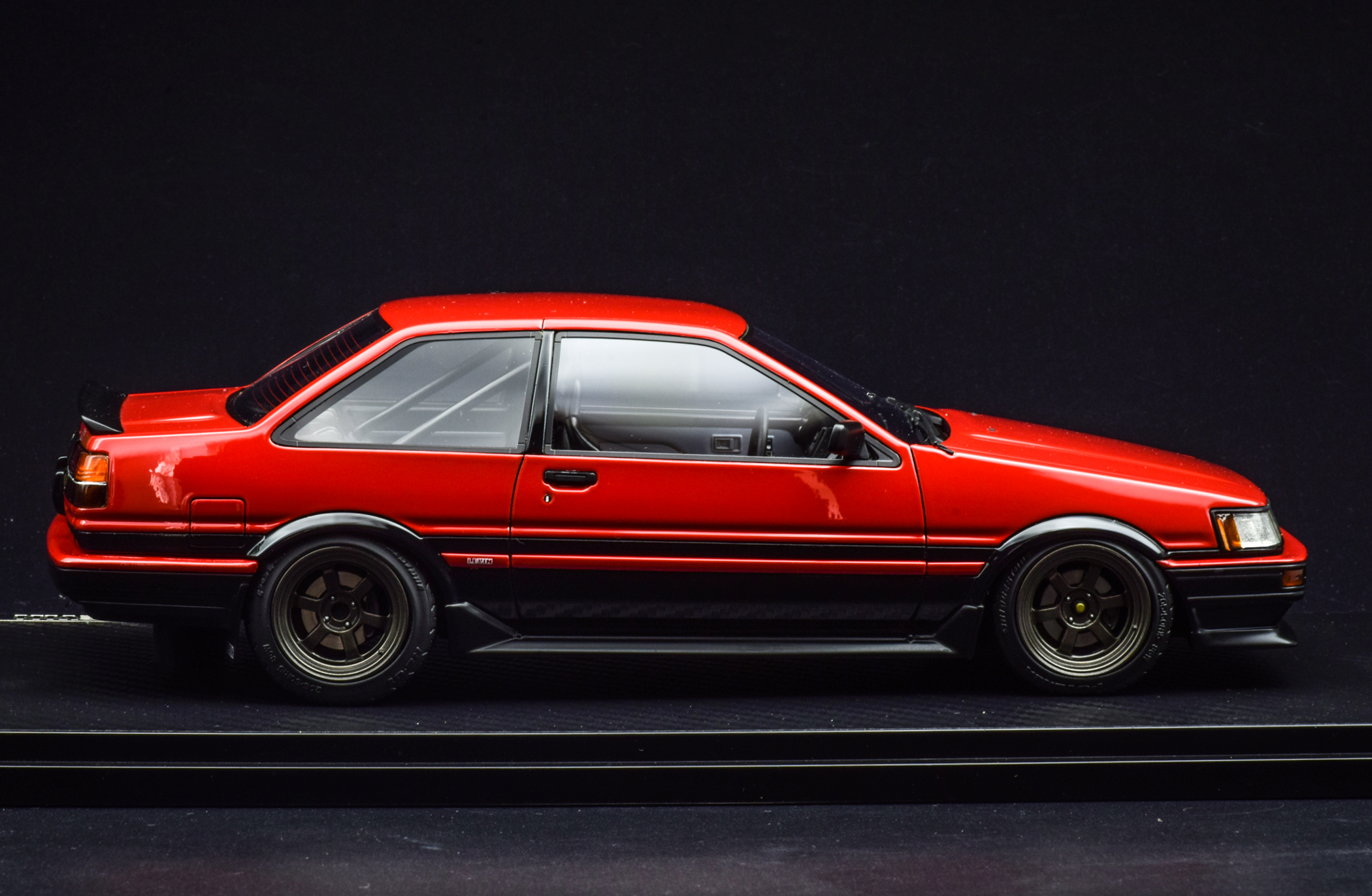 与我们熟悉的 Trueno 另一个不同之处就是该车为两门 Coupe 版本车型,而 Trueno 是掀背造型。IG 一如既往的还原了小改装的样式:加装了防滚架、更换 Bride 赛车座椅、降低了悬挂高度还改装了轮毂。