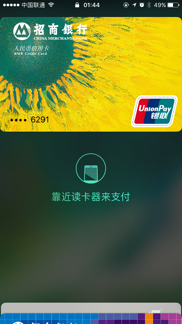 支持闪付的pos机,锁屏状态下按两下home键,指纹识别,手机挨到pos机闪付感应的地方(有闪付标志)。或者直接手机靠近pos机(wallet会自动打开),同时手指在home键上