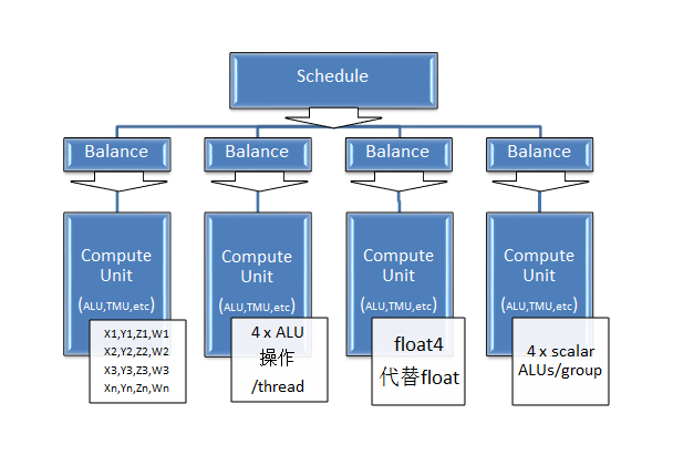整体感觉有点类似于amd的vliw,4个alu为一组,fp32操作都是用的矢量float4类型,和vliw如出一辙。一组cu运行一组或多组workgroup,不过不理解为什么不管多少alu都设置成4组cu。