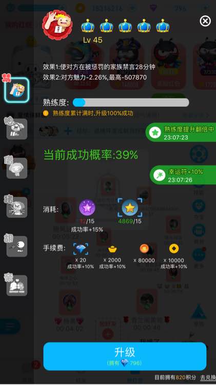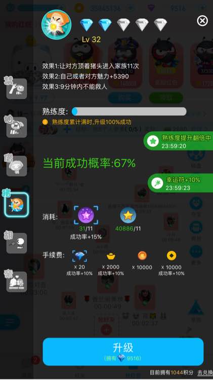 终于把技能上了一个台阶!花了4万星星,首冲328元,加上技能加成星和双倍幸运星!升级过程实在是掉的心惊肉跳,在失败无数次后终于把抽升到了绿!估计就升抽就花了一半星星,因为钻石少就没买紫星星,都是用积分换的!一共九千多钻石,花了两千多钻石,其余的升完后买成礼包了!下一次估计过年升了,后面升绿冠金星星和金币都没有用了,得使劲攒紫星星和钻石!看起来是不是养眼一点