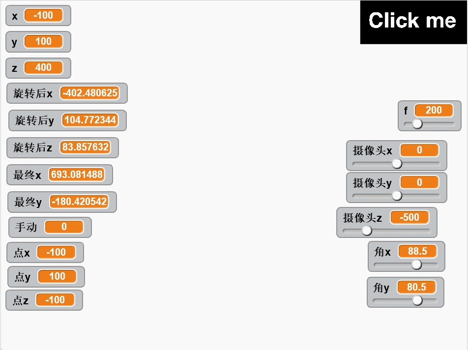 如果摄像头旋转,而且平移,我的想法是让点恢复到没有旋转之前的坐标,再运用上一个算法,旋转需要用到旋转矩阵(如果大家对矩阵感到陌生,就理解为旋转需要用到旋转公式)