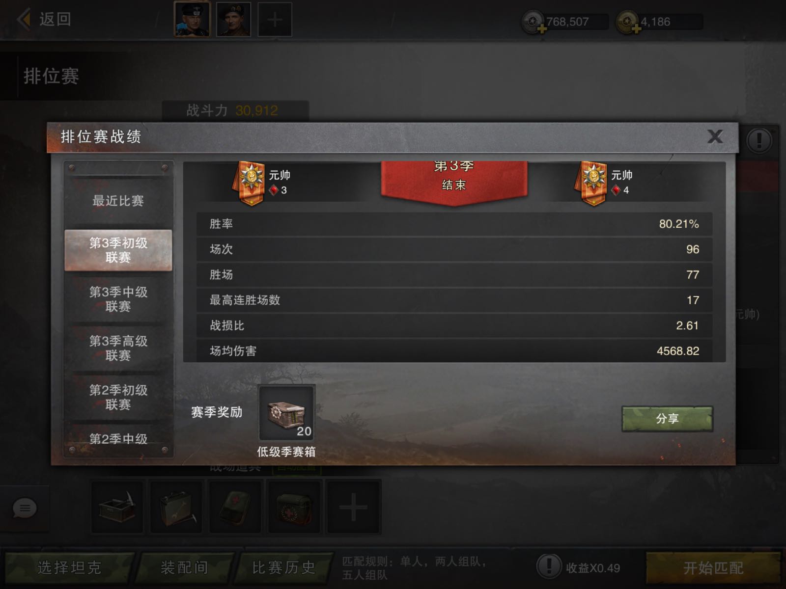 你看看我上赛季高排的胜率和场均伤害 一个黑豹打成这样比很多六级车还高吧