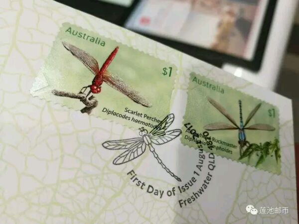 2017年8月为澳洲集邮月。8月1日,澳大利亚邮政发行《蜻蜓》邮票一套5枚,面值均为1澳元;小全张一枚,为一套邮票,面值5澳元。另有不干胶小本出售。这套邮票作为集邮月的主打内容,澳洲邮政可谓是做足了宣传,并且设计也独具匠心,巧妙利用印刷工艺和票幅大小,将4种蜻蜓和1种豆娘展示的活灵活现。