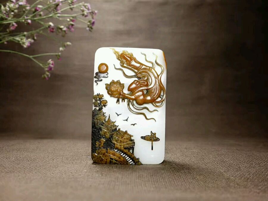 【飞天献莲】 132g 69/43/18mm 和田玉山料黑皮。白度上佳,玉质细腻,油润缜密,皮质醇厚。牌型大气,器表采用气色浮雕飞天仙女,身姿曼妙,纤巧弄姿,面色柔和,双手捧莲;底部皮质巧雕亭台楼阁,江中渔舟轻划,大雁畅飞,一片繁荣祥和。黑飞天原是佛教艺术中乾闼婆和紧那罗的化身,是八部侍从中的两类。当代此类作品稀少,极具收藏鉴赏价值,寓普降甘露,繁荣昌盛。