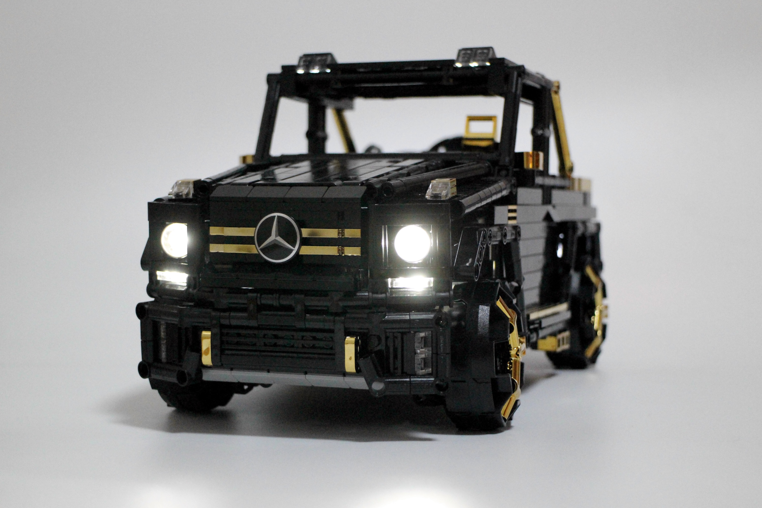 作品属于中型尺寸乐高科技类MOC,在保持与实车比例一致的前提下,进行了大量的颇具攻击性的外观改装,大灯、日行灯、尾灯均配LED;委托工厂对部分装饰零件进行喷镀,并设计了低阻力的“三叉星”外观车轮,起步会有打滑效果。