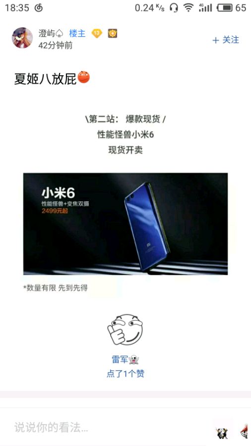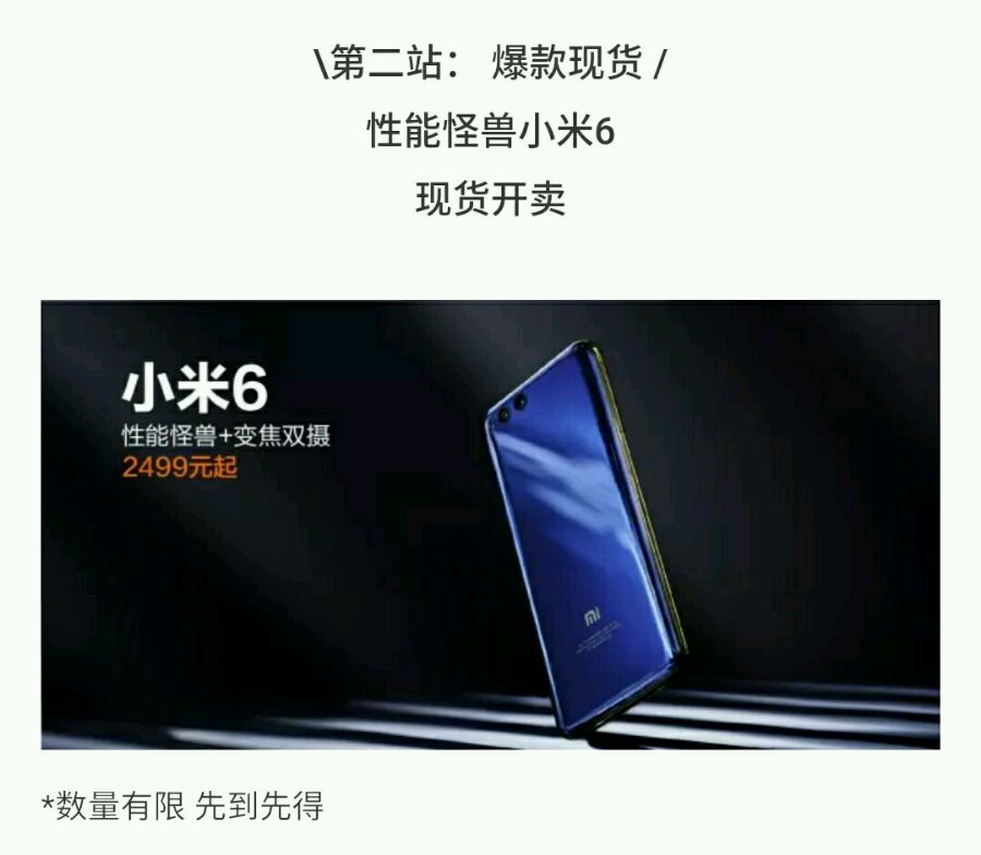 是小米之家公众号的宣传吗?实际上,去了几次米家,米6基本算是敞开买了吧,每次都有货,当然仅限黑蓝色,白色比较少。