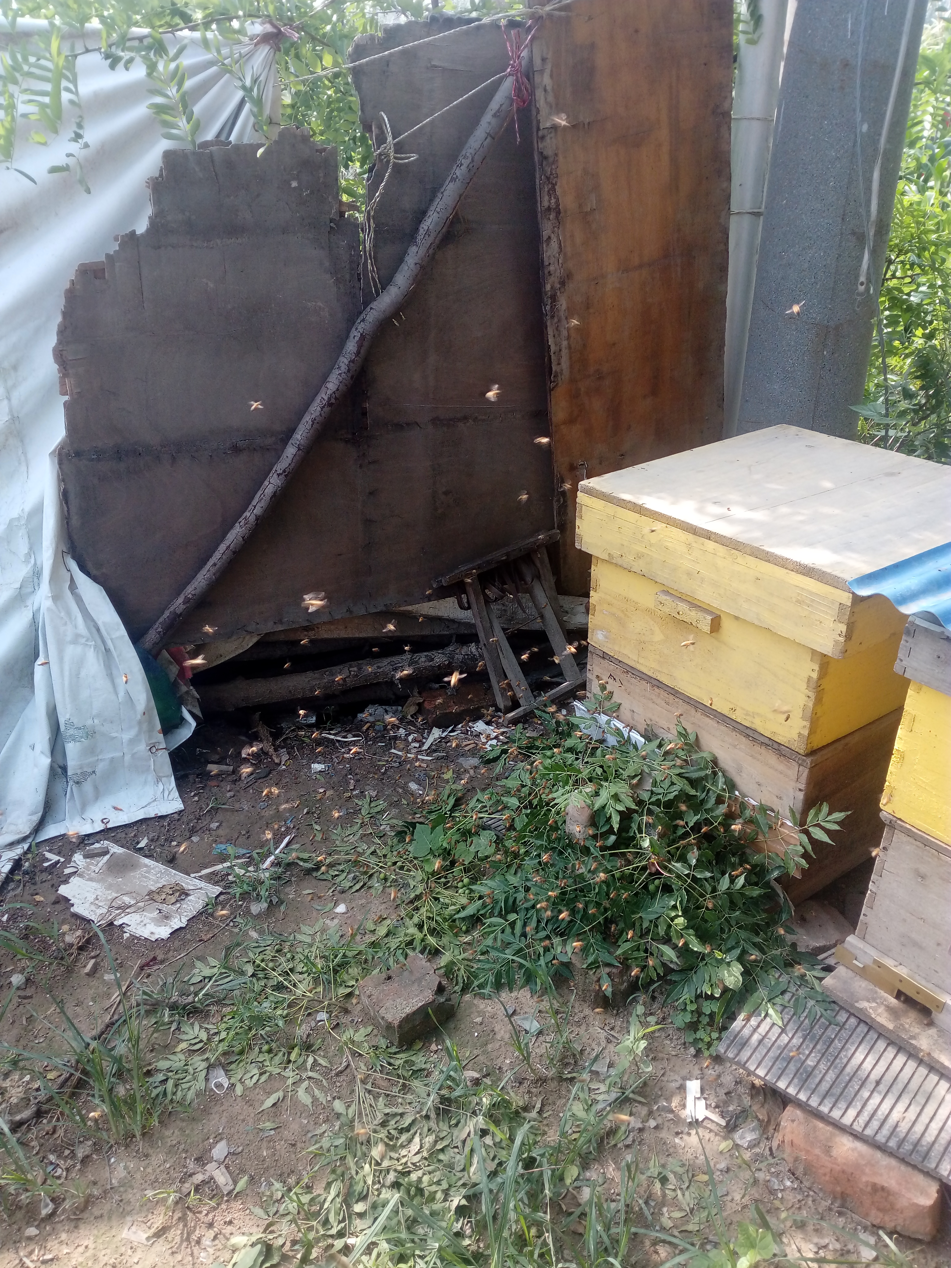 昨天下午,盗蜂四起。我用楝树枝