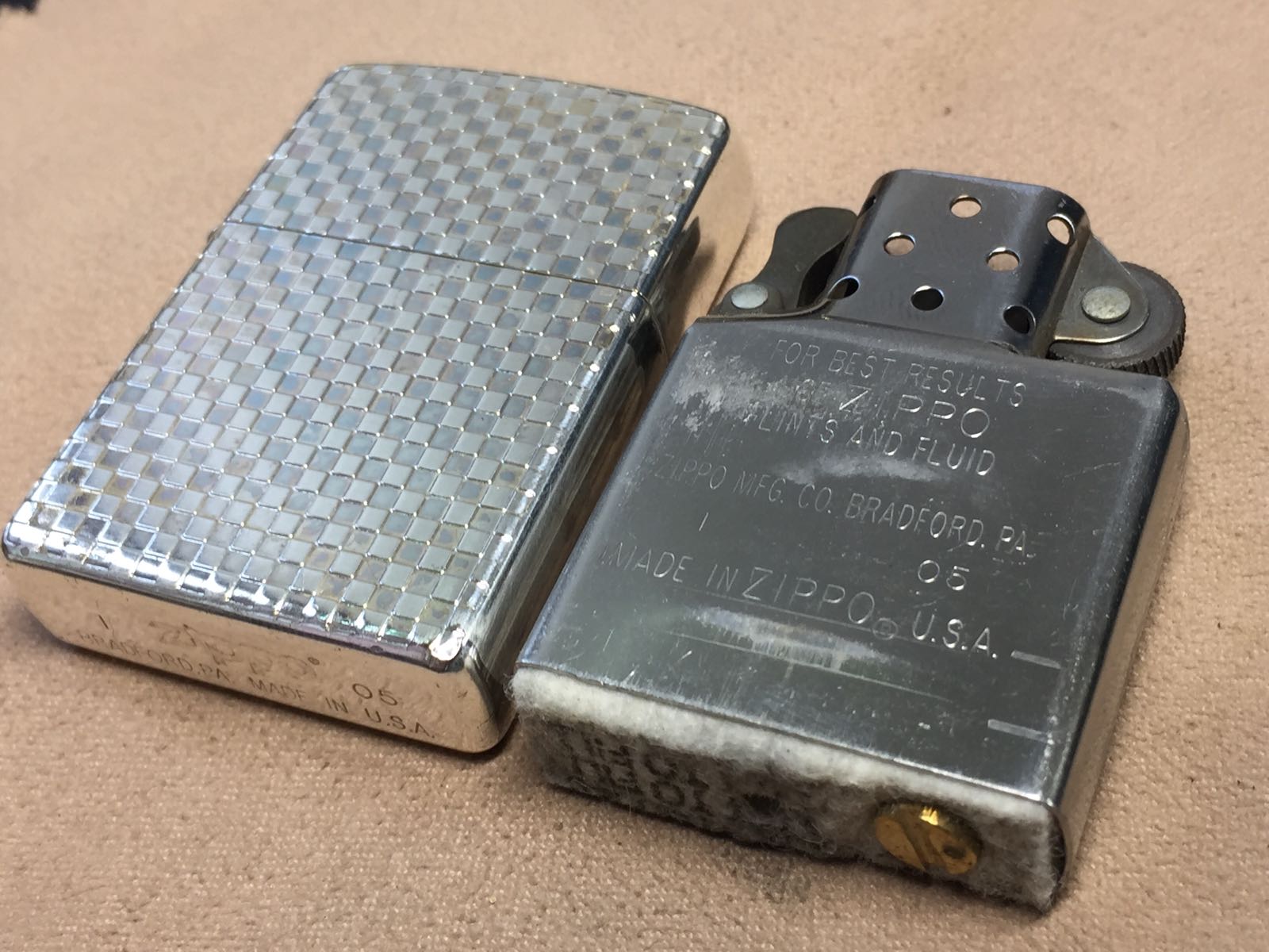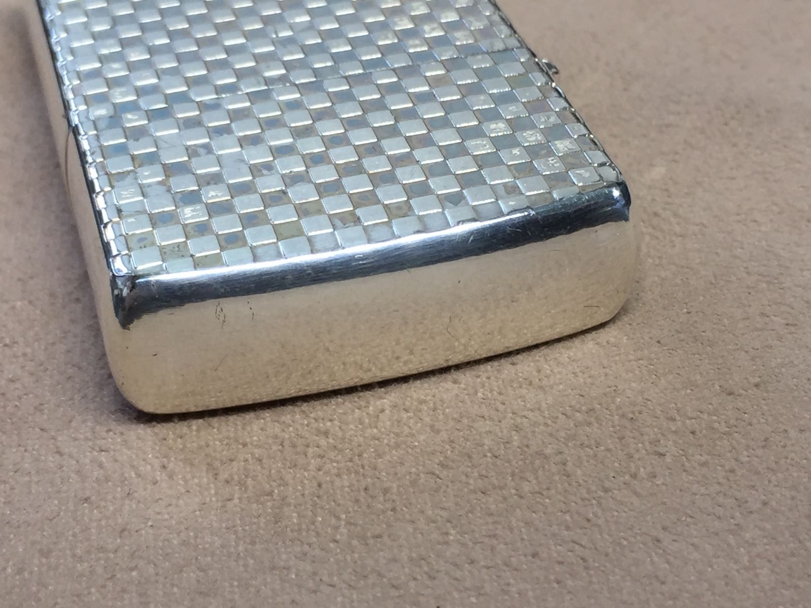 【具体描述】二手2005年9月镀银机 双面蚀刻编织纹。机身正常使用擦丝擦痕,镀银层局部磨损痕迹,底部两处针眼微距拍出,无明显磕碰,定义一般品。铰链略松,原配同年同月内胆打火不错,无包装。