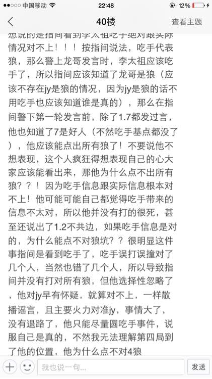 当然,当时是不是狼人发言就吃手,作为外人没有视频的情况下,确实是不能断定的,但没逻辑的直接否定的话,还算一个正常的狼人杀玩家吗?