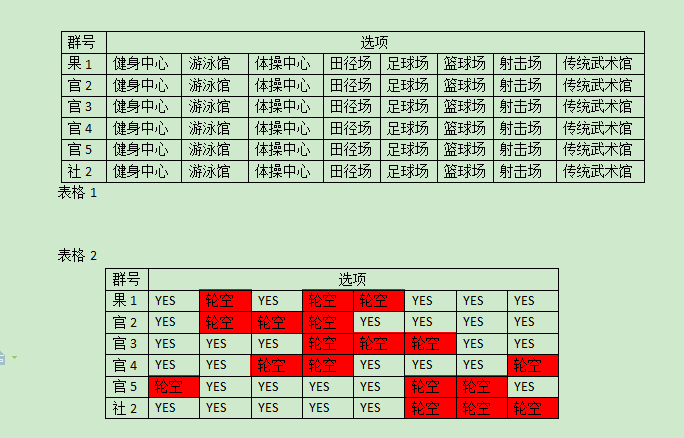 表格2当中红色背景的数字为轮空选项,其他选项为正确举办活动的场地选项。
