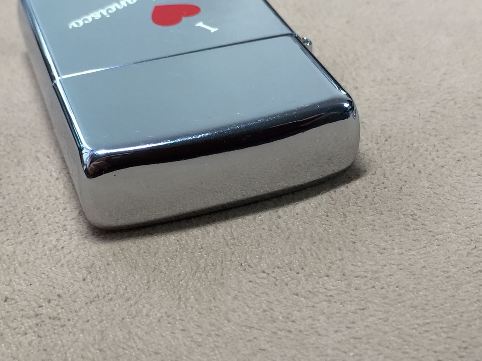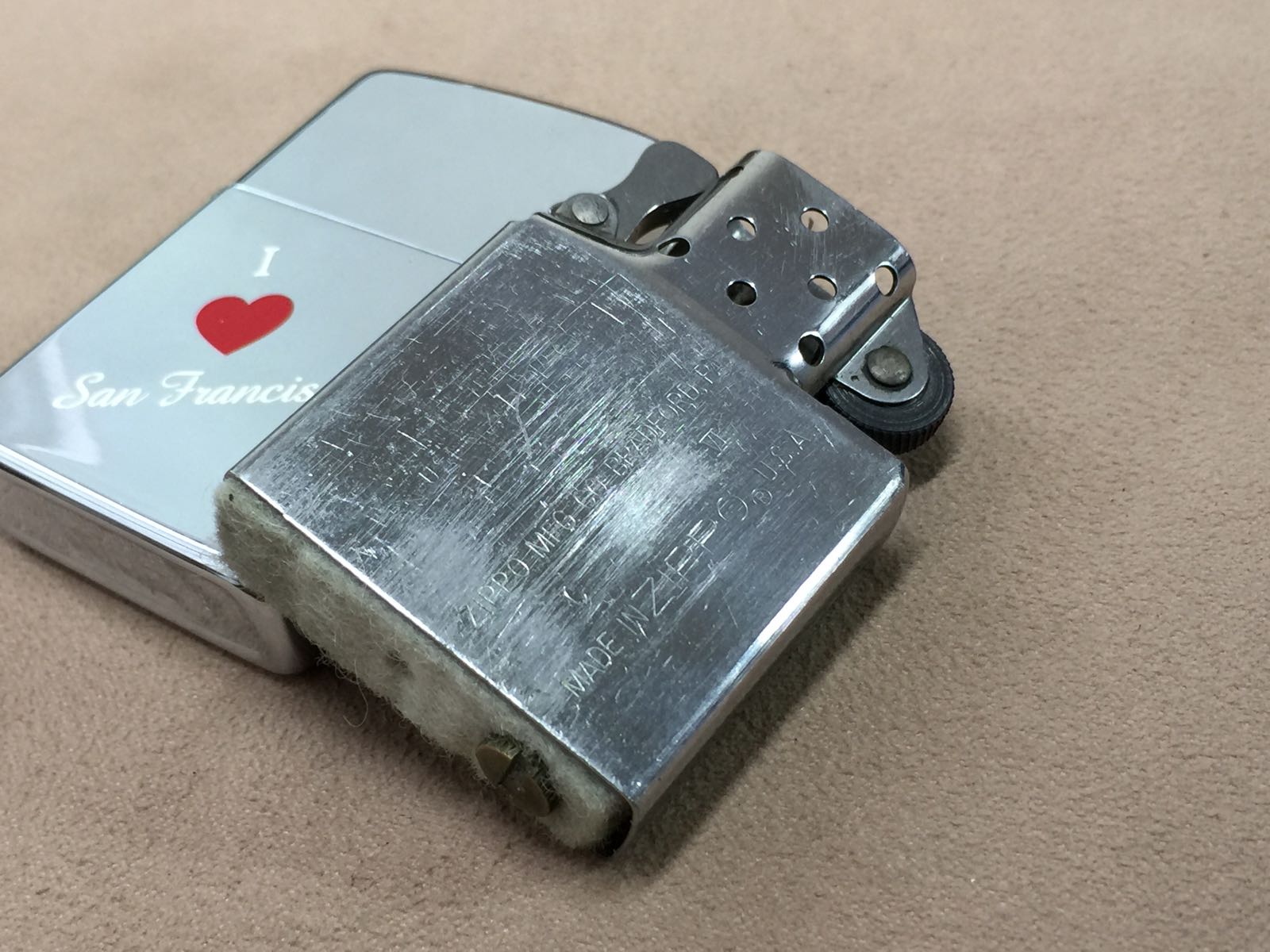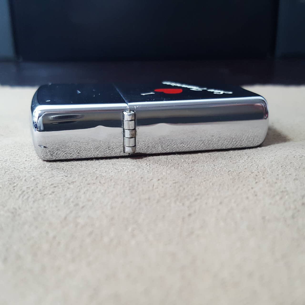 【具体描述】二手1989年2月 镜面蚀刻填漆工艺 我爱旧金山 反底刻。机身正常使用擦丝擦痕强光拍出,背面局部磨损痕迹,顶部两处小磕和少许针眼微距拍出,定义一般品。铰链正常,原配90C内胆打火强,无包装。