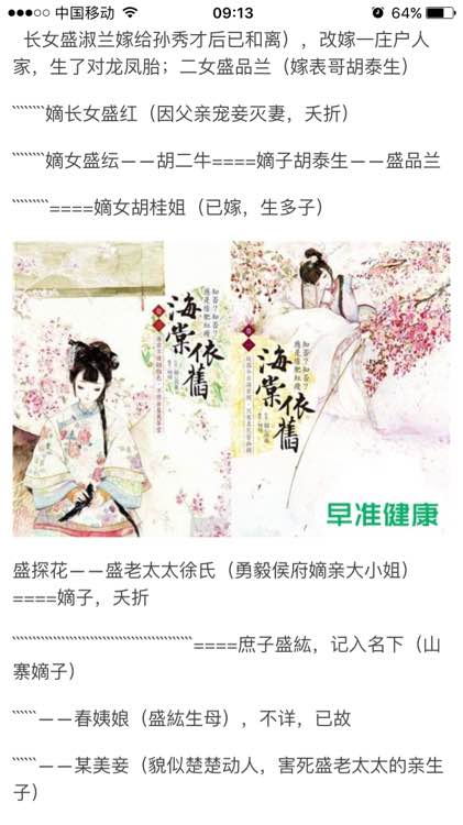 嫡长女:盛华兰,王氏之女,骄傲明媚,嫁给忠勤伯府二子袁文绍(胞妹袁文樱,嫁给自己姑母的儿子),至少生了四个孩子,长女庄姐儿嫁给薄小将军。
