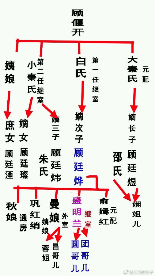 次子顾廷烨,妻子余嫣红(偷人被曼娘设计而死),继室盛明兰,生有四个儿子。