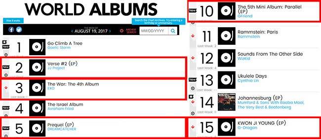 美國 Billboard (告示牌) 世界專輯榜公開8月19日的週榜單 (即8月13日至8月19日此週),JJ Project、DREAM CATCHER、GFRIEND 的新專輯都榜上有名!