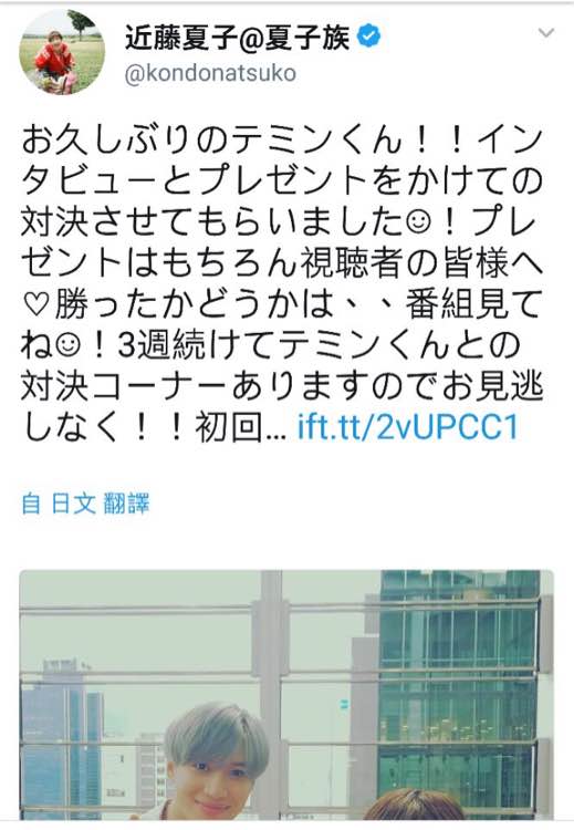 翻译日文消息:【好久不见的泰民!!在采访泰民后进行了赌上礼物的胜负对决,礼物当然是送给各位观众的!到底有没有赢呢、、请观看节目哦!节目连续三周都有与泰民的对决环节,不要错过!】