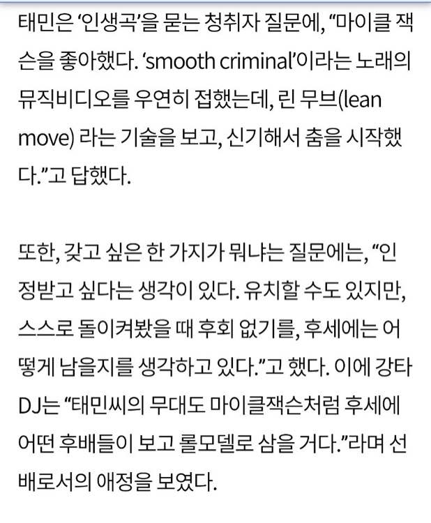 翻译新闻标题:【泰民在星夜里说他是看了迈克尔杰克逊的lean move才开始跳舞的】
