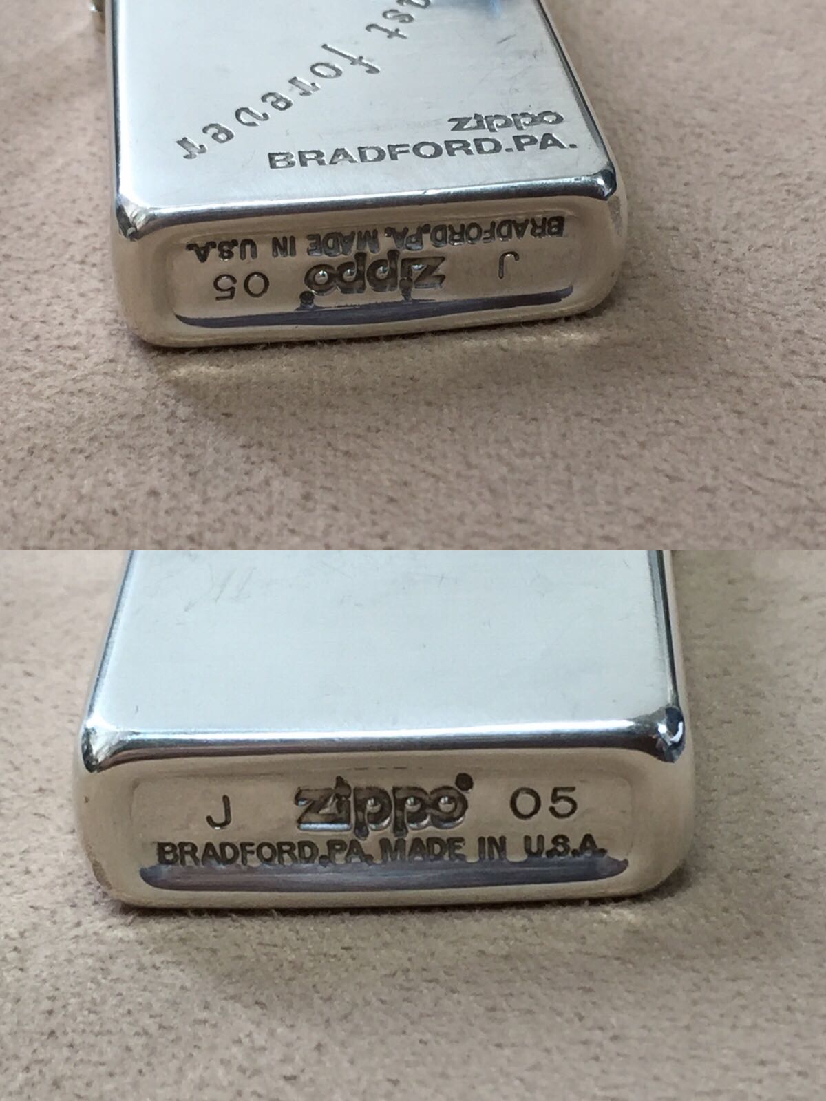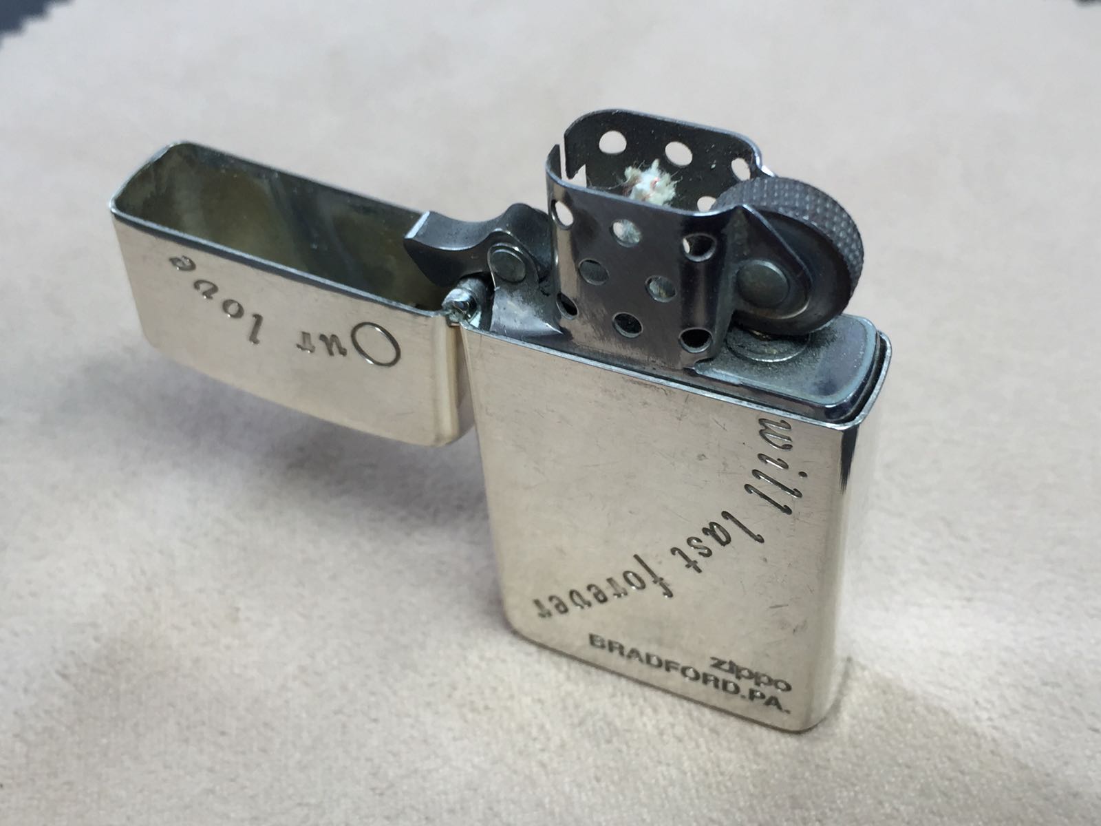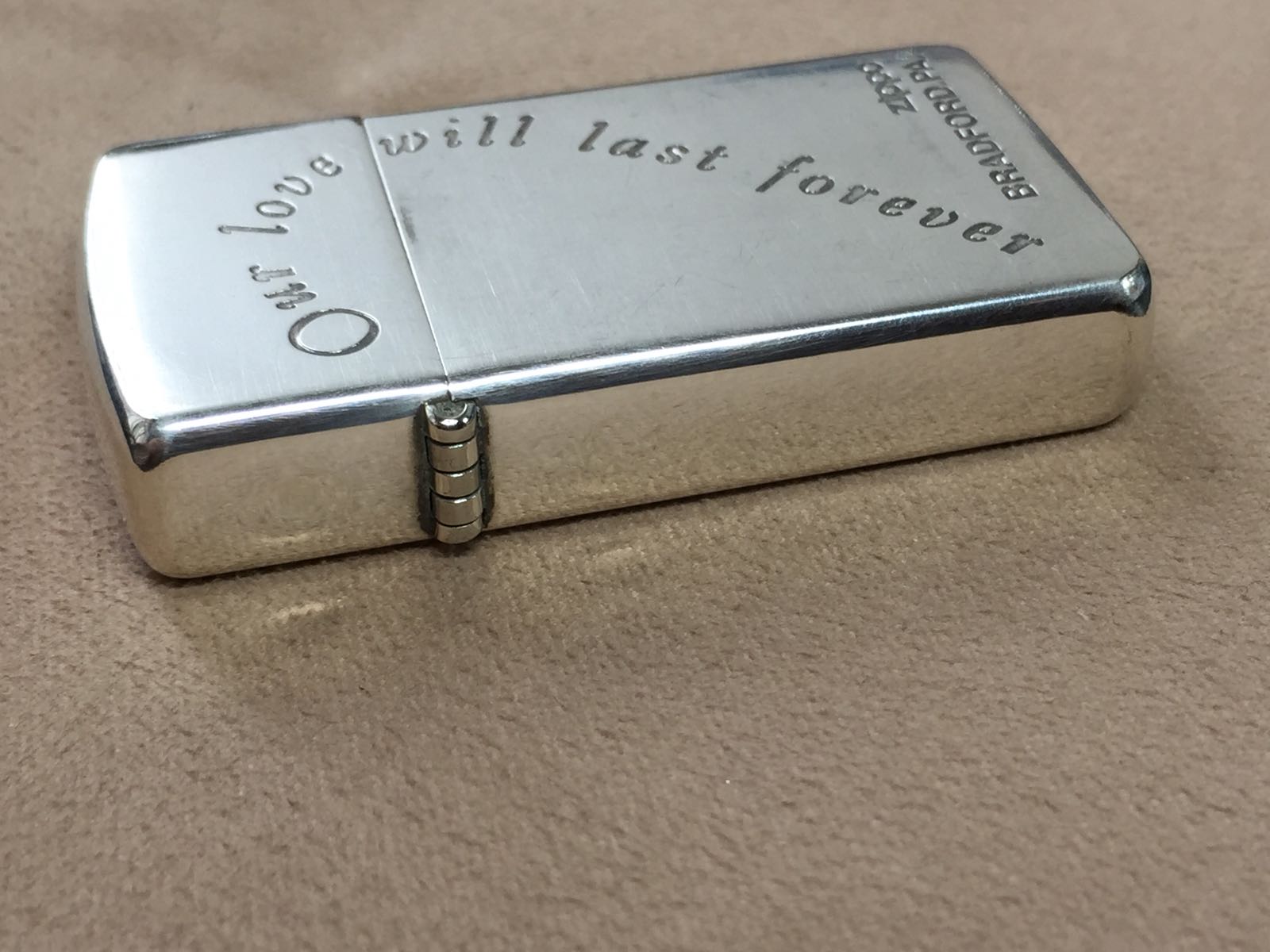 【具体描述】二手2005年10月 镀银蚀刻窄机 Our love will last forever 我们的爱永恒 反底刻,对机中的一枚。机身正常使用擦丝划痕,镀银层局部磨损 氧化,边角几处磕碰微距拍出,定义差品。铰链正常,原配05H内胆打火中等,无包装。