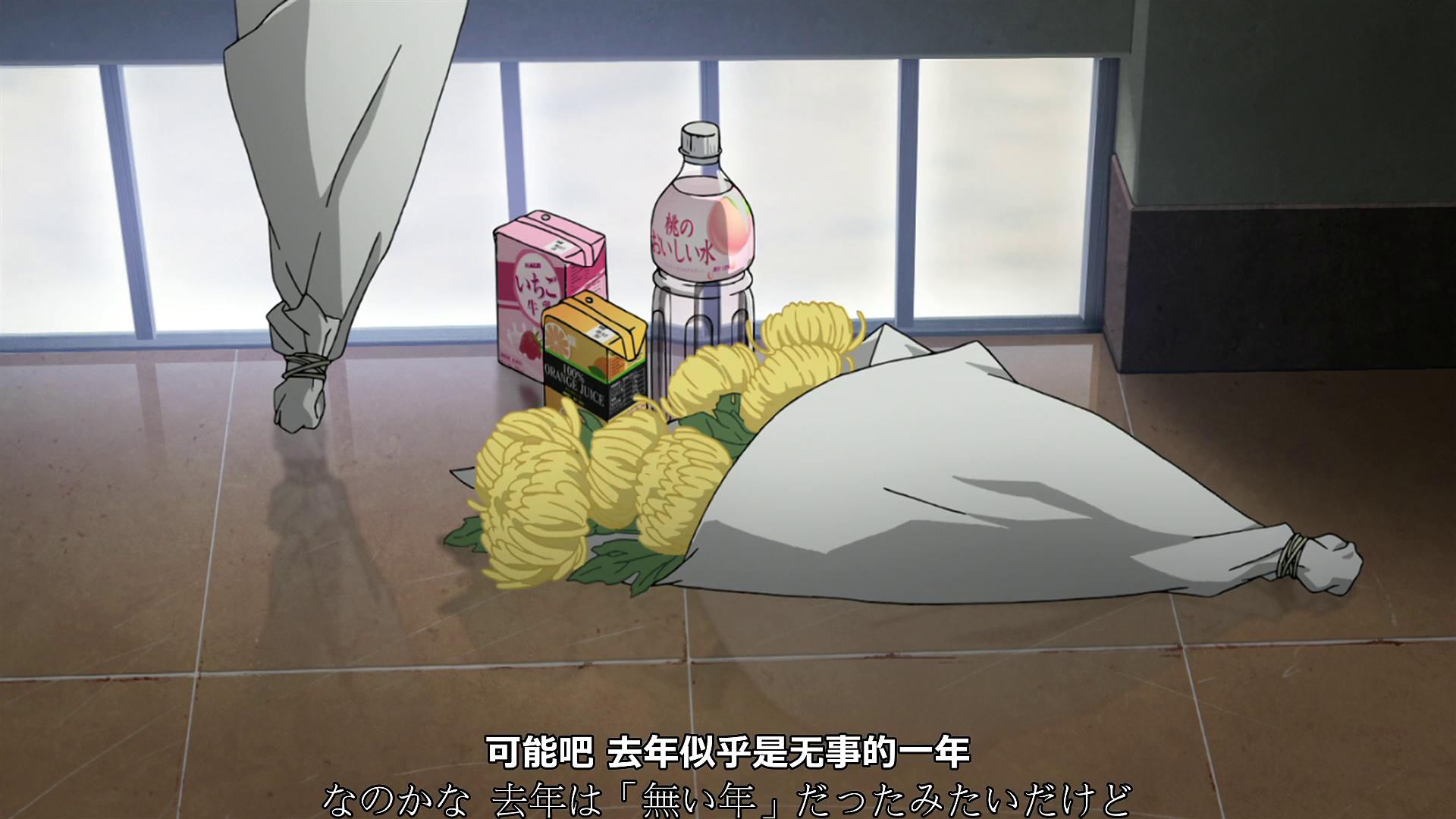 04话0分55秒,在尤加利去世的楼梯上有人放了花和饮料来祭奠她,经查证,这些饮料在日本都是很热门的饮料,例如100%橙汁。