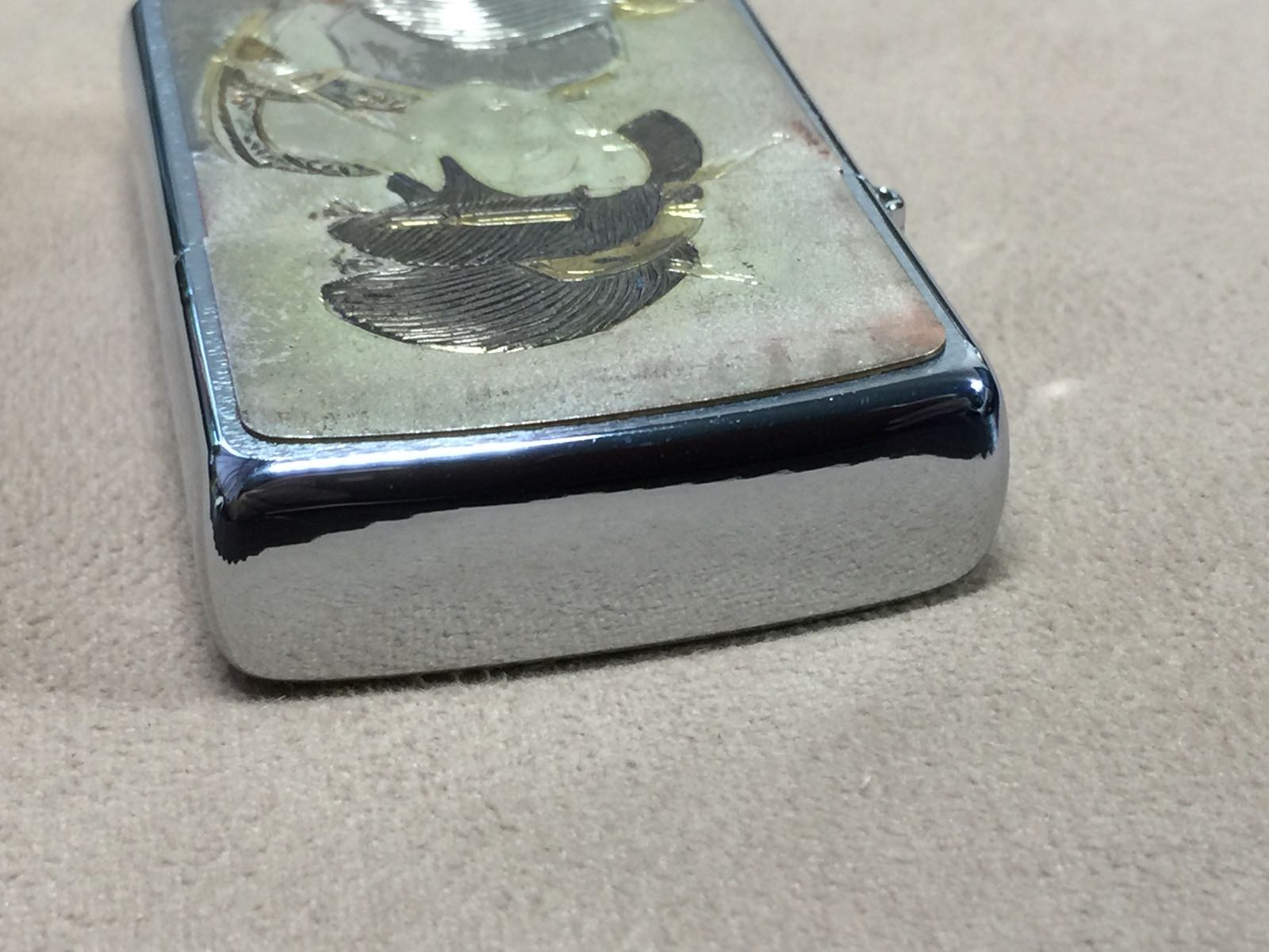 【具体描述】二手2005年1月 电铸板工艺 浮世绘。机身正常使用擦丝,无磕碰,贴章轻微氧化。铰链正常,原配04L内胆已更换全新进口火轮,打火强劲,黑纸盒包装。