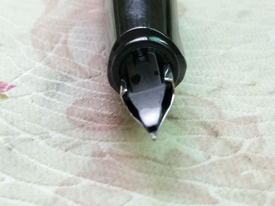 然后,这支笔的笔尖铱粒形状还类似于永生2002。而永生2002是我手中写字感觉和出锋效果超过老国金金笔的大明尖(35mm)普通钢笔(它将在我憋了好久的测评系列文章中出现)。