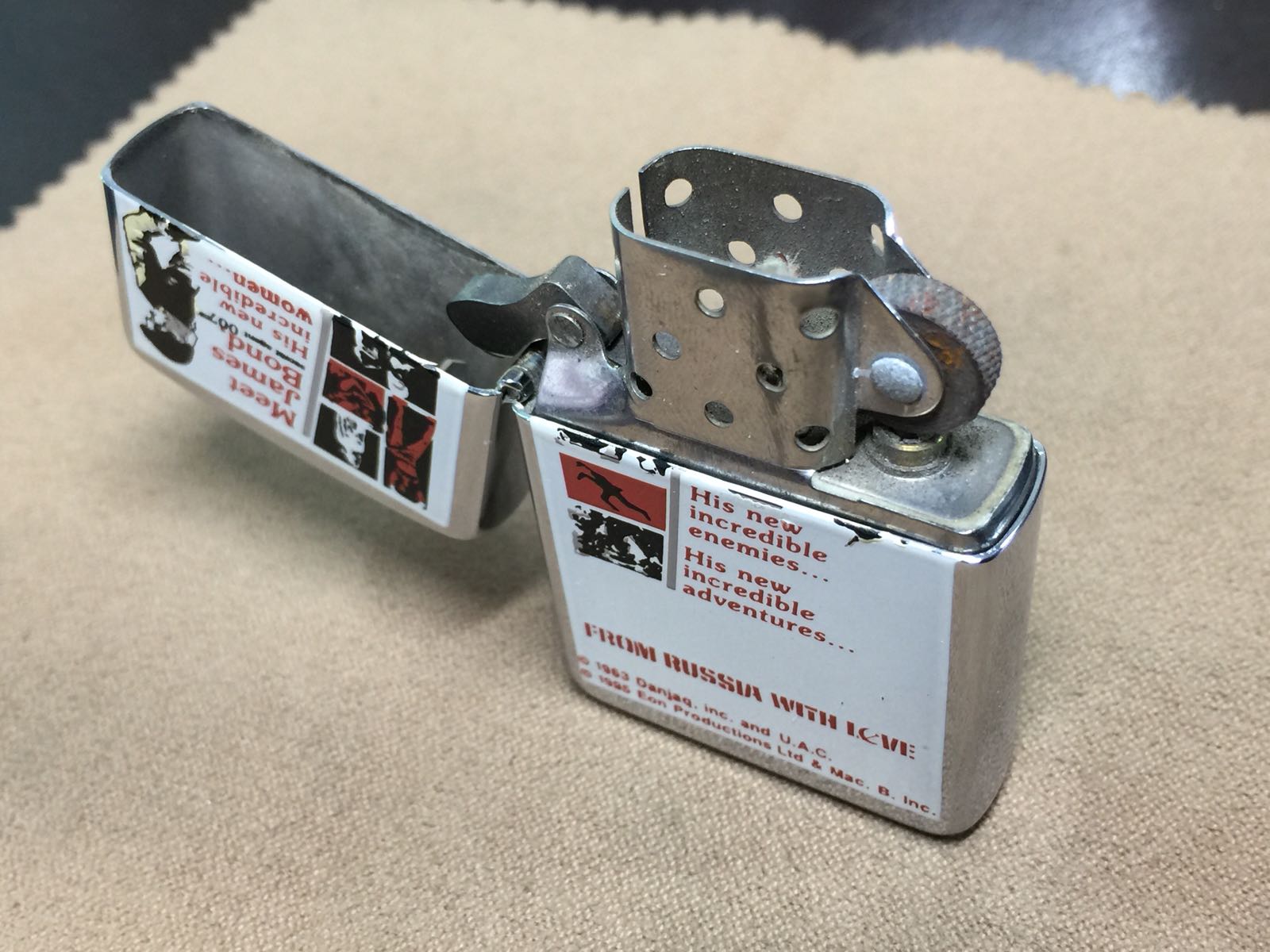 【具体描述】二手1996年 电影007系列,镜面彩印工艺。机身正常使用擦丝浅划痕强光拍出,整机无明显磕碰,底部一角极浅平磕微距拍出,彩印图案有轻微掉色 总体品相不错。铰链正常,后配16A内胆打火强劲,黑纸盒包装。