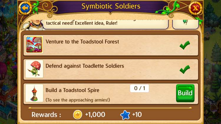 Level 2: 30 sparkling toadstool, 10 wood, 10 stone, 30 fuzzy moss | coin / hours