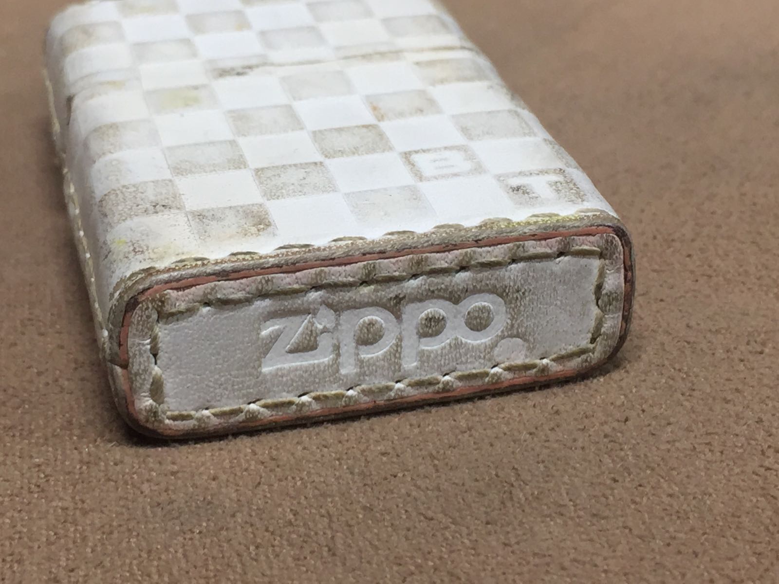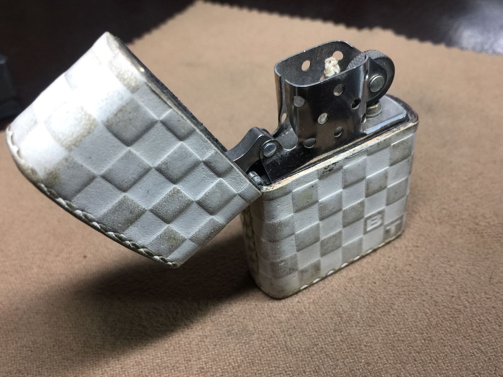【具体描述】二手2000年左右日版包底真皮机,手缝牛皮粘合工艺,五面热压棋盘格图案,正面BT标识。机身皮面无破损 无脱线,正常使用污渍,合盖处皮面轻微褶痕微距拍出。铰链正常,原配2000C内胆打火强,无包装盒。