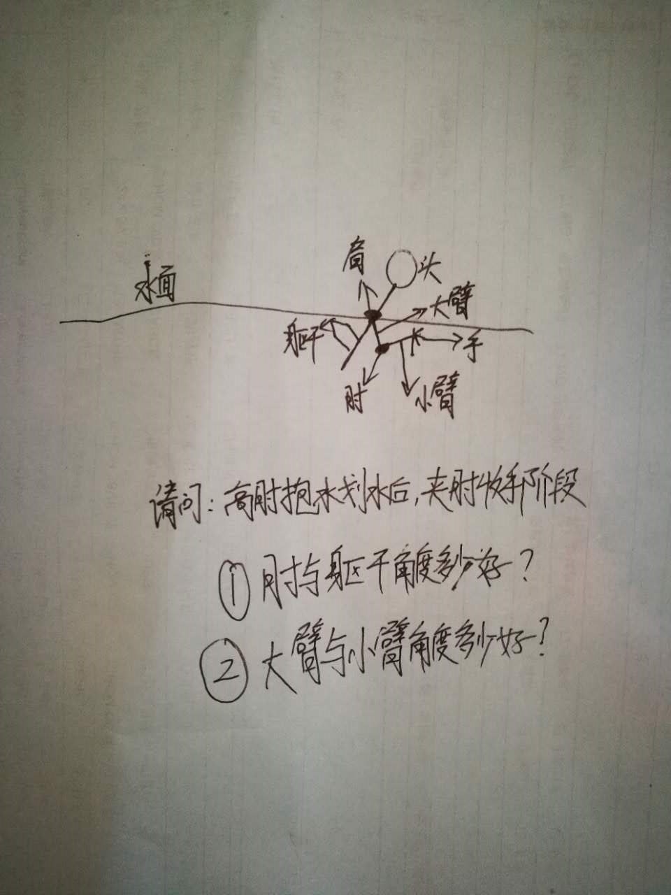 先简单阐述一下。。手前伸角度一直在变化。所以去找一个固定的角度不对。。。手前伸要做到的是尽量【】【】提肩。夹肘。。。。这俩个做好。。手【】【】肘到手掌和水面水平出去就可以了。或者你略微向水里去插手。。这拉高不同。角度不同。