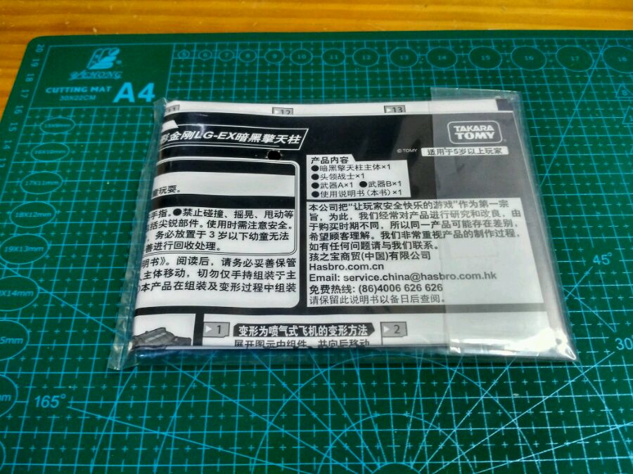 开内包,和之前的LG-EX一样,内包是纸板,玩具是载具形态,由塑料袋包好【这包装比通贩还省啊】说明书放在上面,武器也是一样包好绑在侧面。好的那么我有个问题,说明书是两份,有份中文,等会拆开看看。之前吧友走亚马逊直邮的应该是纯日版,说明书是日文。我是3c的,说明书两份在里面,,但我是双侧单封的。代工厂是越南,是不是说明在出厂的时候就是分日本批次和大陆批次的?