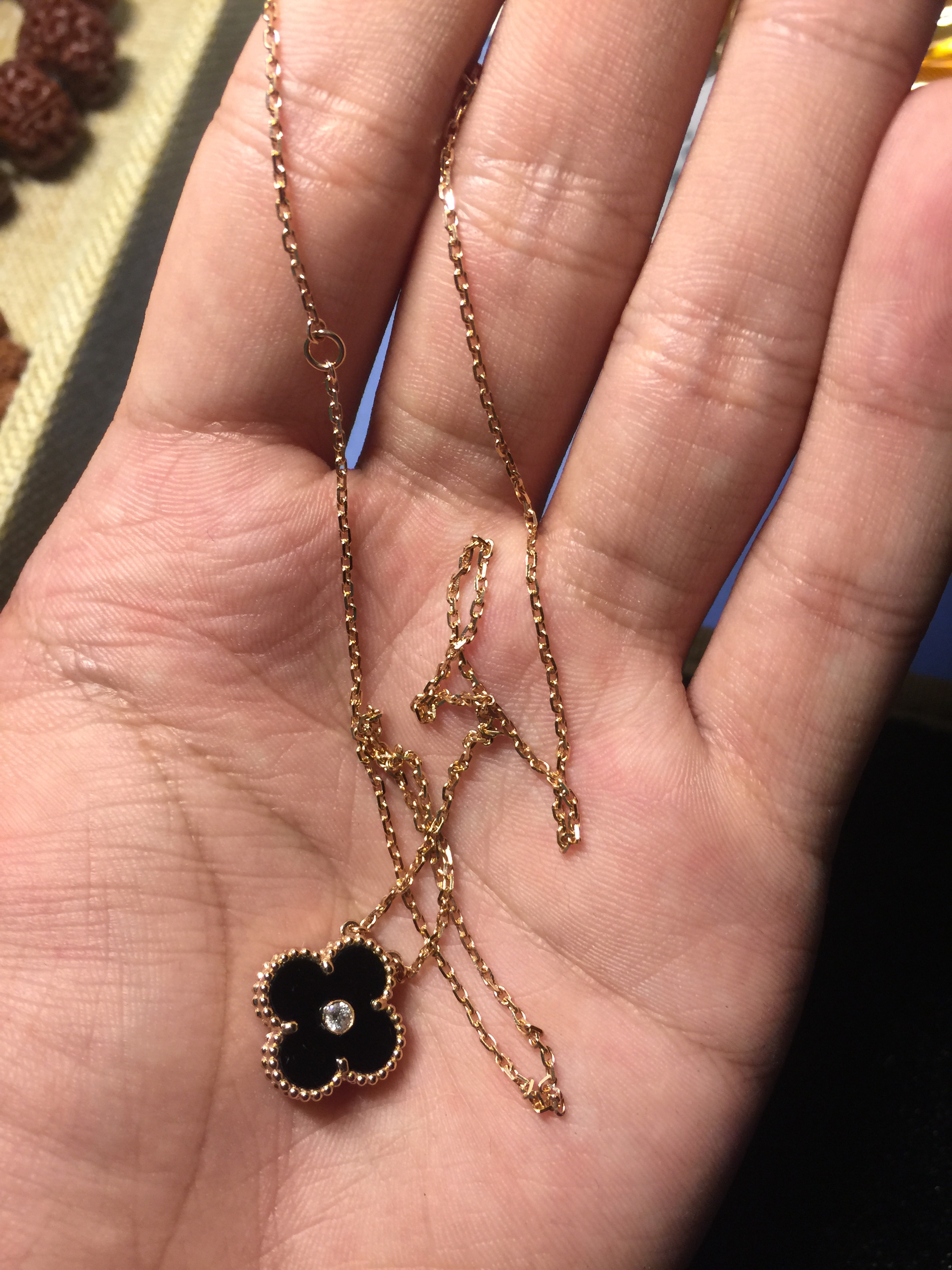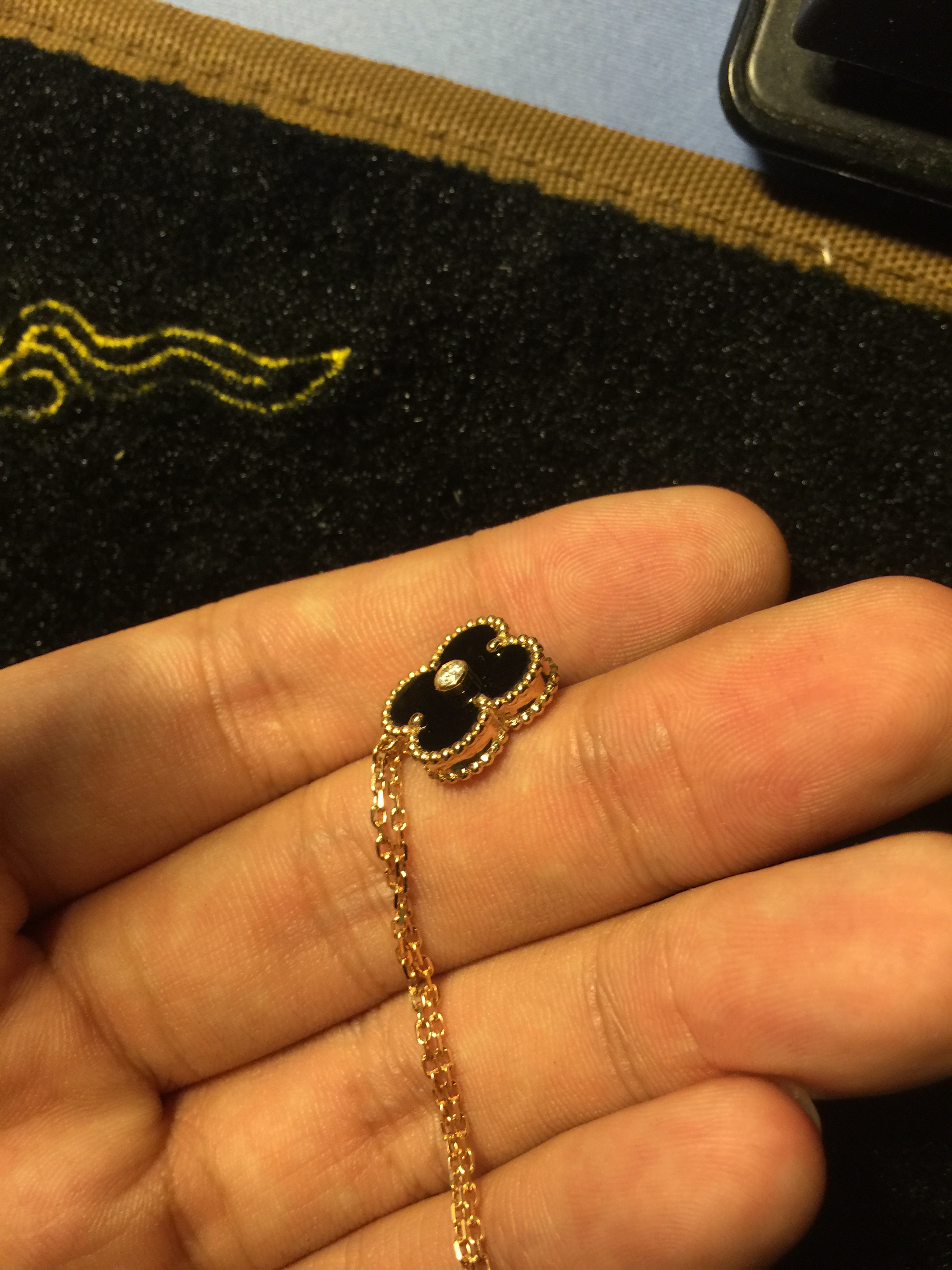 专柜的扣链方法,但是应该不是专柜货,因为专柜的字印不一样,而且专柜的石头镶嵌的没这么好的!