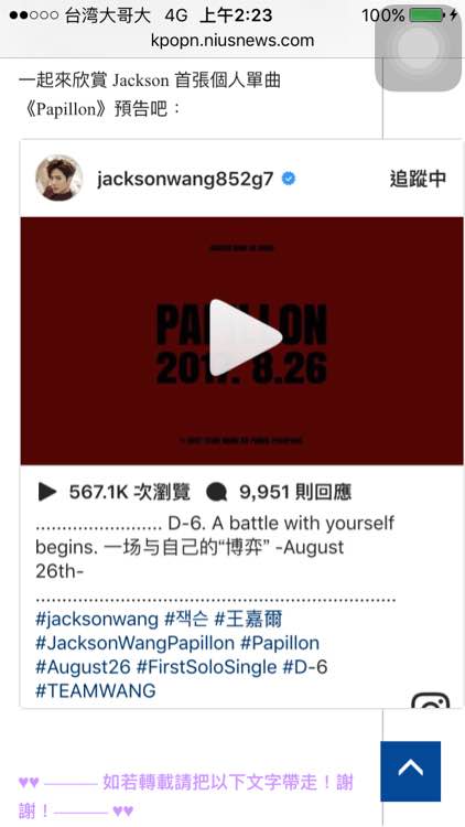 GOT7 的 Jackson 將在8月26日發行首張個人單曲,正式 SOLO 出道。 Jackson 不久前在中國與知名可樂品牌「百事」合作發行自創曲《Generation 2》,於中國音樂排行榜獲得非常好的成績,現在他將正式 SOLO 出道,確定在8月26日發行首張個人單曲《Papillon》,他還透過 Instagram 分享預告照與 MV 預告。 公開的預告照中,可以看到 Jackson 帥氣地坐在跑車上,充滿氣勢;而《Papillon》MV 預告中,在充滿神秘感的節奏下,Jackson 走進華麗的房間中,還與朋友們一起吃飯、喝酒,令人對由 TEAM WANG 打造的新曲風格感到好奇又期待。