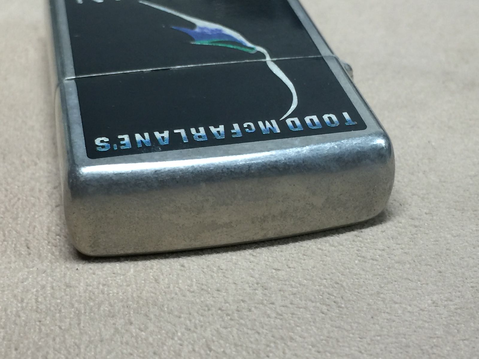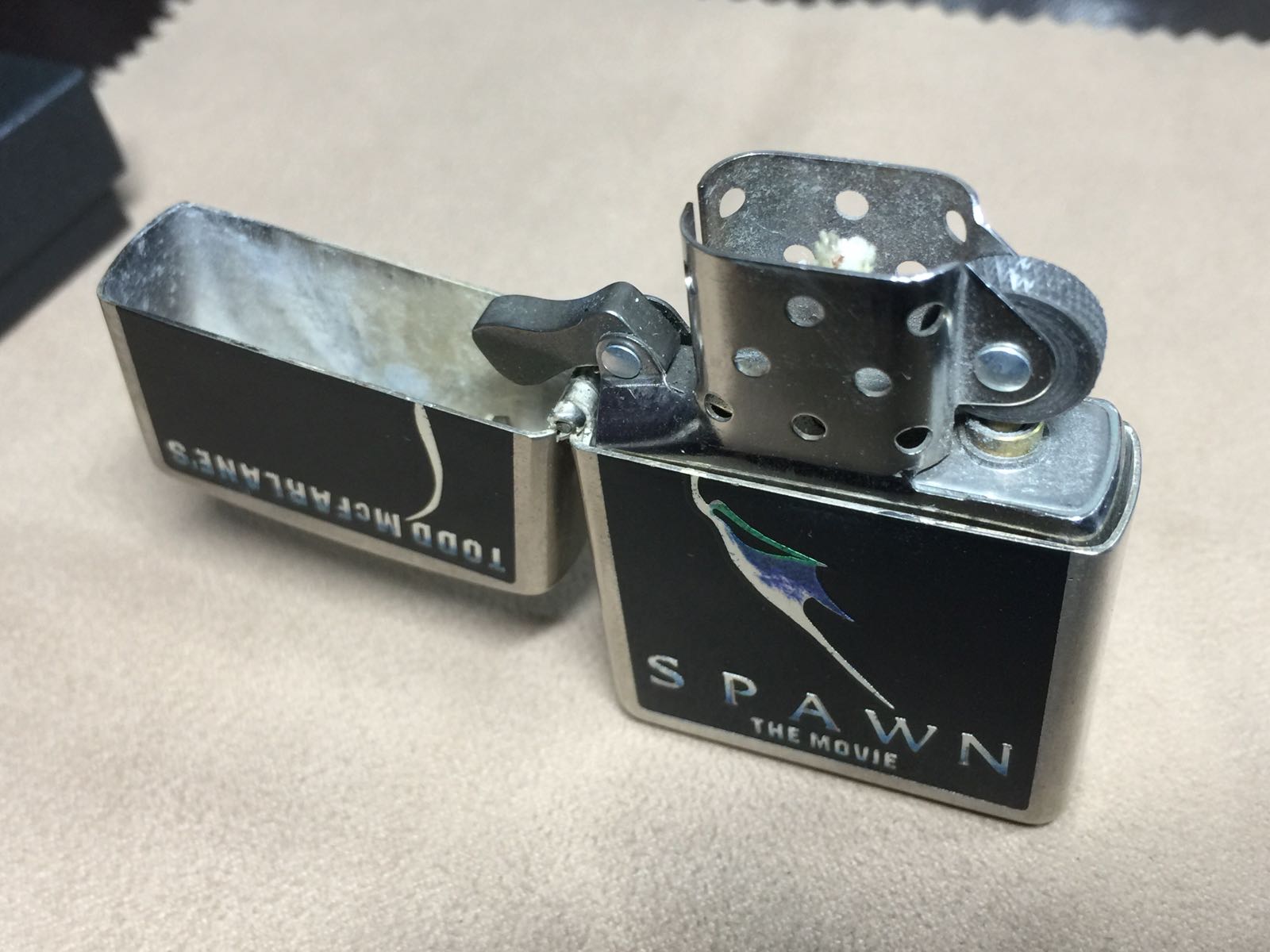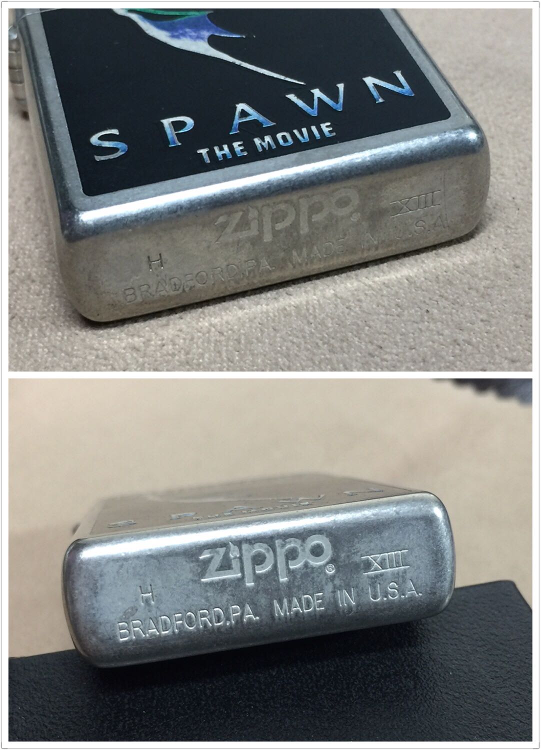 【具体描述】二手1997年8月 电影再生侠 限量首映纪念机 本机编号0379。镀银花砂底板 正面全幅蚀刻填漆工艺。机身无磕碰,镀层局部轻微磨损痕迹,总体品相不错。铰链正常,原配同年同月内胆打火强劲,黑纸盒包装。