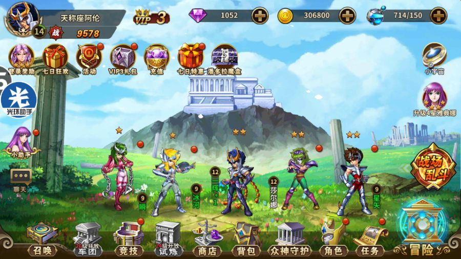前期阵型:紫龙,卡妙,冰河,娜娜,十连送的黄金