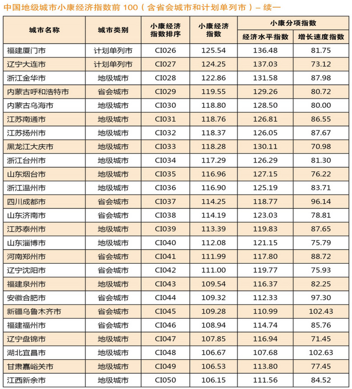 中国地级城市小康经济指数前100