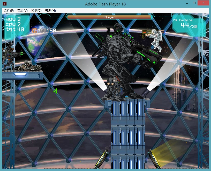 2D横版射击游戏,几年前经常玩。剧情是讲未来4个颜色的队伍去外星抢夺能源,然后互掐。游戏玩法和《外星人特战队》差不多,武器很多,也是在荧光地区捡起,下面是外星人特战队截图。