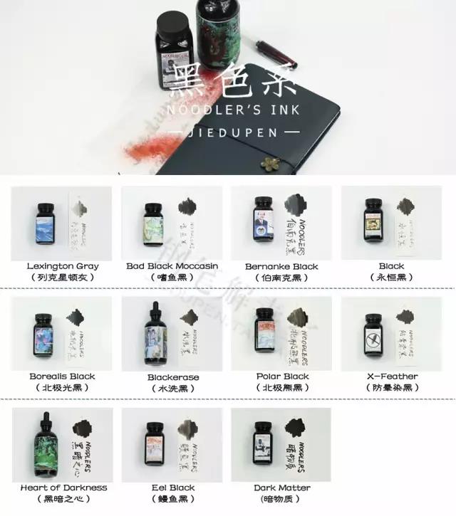 黑色系里比较出名的墨水有永恒黑,以及黑暗之心。各项性能都很强大的永恒黑并没有你想象的那么黑,也有人叫它永恒灰,当然不是列克星敦灰的灰色喔,如果需要很黑的墨水你可以选择黑暗之心。