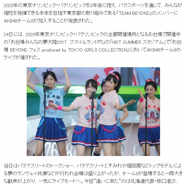 2020年の東京オリンピック・パラリンピックを3年後に控え、パラスポーツを通じて、みんなが個性を発揮できる未来を目指す東京都の取り組みである「TEAM BEYOND」のメンバーにAKB48チーム8が加入することが発表された。