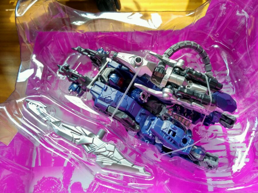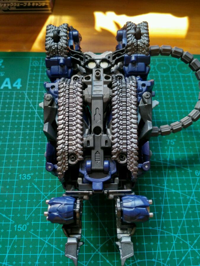 花了差不多5-6分钟变玩,还是熟悉的味道。但是质量比以前更上一层楼。齿轮关节非常有力,能卡住各种动作。膝盖因为是变形需要,可以有二段关节,大腿背后镂空忽略,毕竟变形需要。总体来说是真美。在透明件在阳光的作用下透露着深红的杀意。四肢的弯折度在90度左右,但足够了