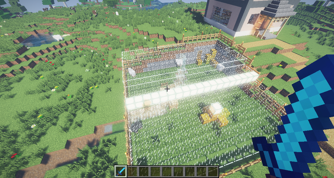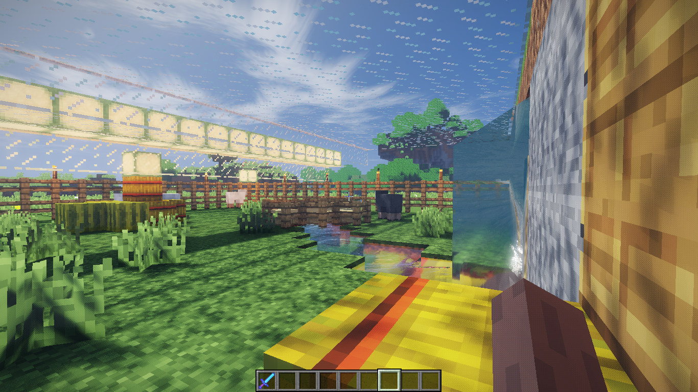 7.痒痒厂加了玻璃顶棚,增加光照,随机摆放了西瓜和草垛,开辟了一条小河,河底是萤石会有朦胧的感觉。
