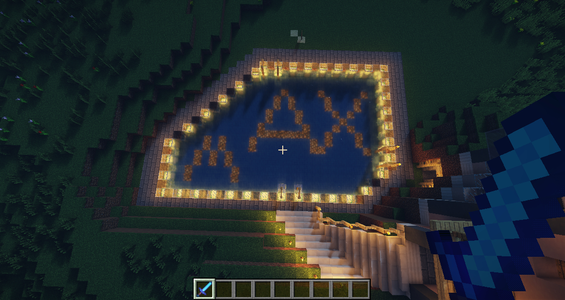 2.泳池:萤石换成了海晶灯,更有水中的感觉,玻璃间隔换成白色玻璃,更有色彩变化,泳池旁增加了三个扶手,方便上下,水底有MAX字样,emmmm。