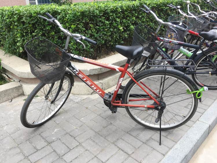 就这样,到了八月。8.31号的中午。我下楼取快递,我看到了它,它被停到了一食堂的门口,它还好,没有被摧残,还是鲜艳的红色,只是被戴上了一把绿色的锁子。