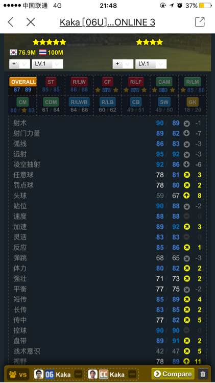 唯一的5星米兰卡卡,数据差距不大