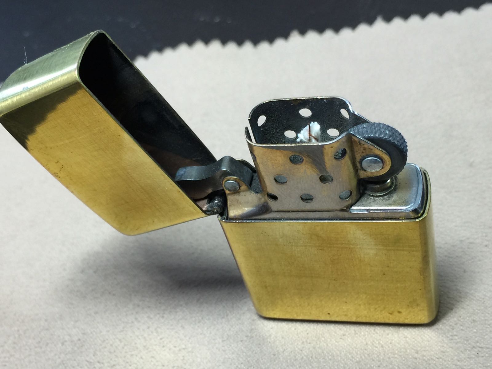 【详细描述】二手2006年9月古铜光板,该机被原机主打磨了5个面,表面有打磨痕迹和氧化,介意勿拍。机身几处小磕 一侧刮痕均微距拍出,定义差品。铰链紧,原配06L金胆有刻字,已更换全新进口火轮,打火强劲,无包装。