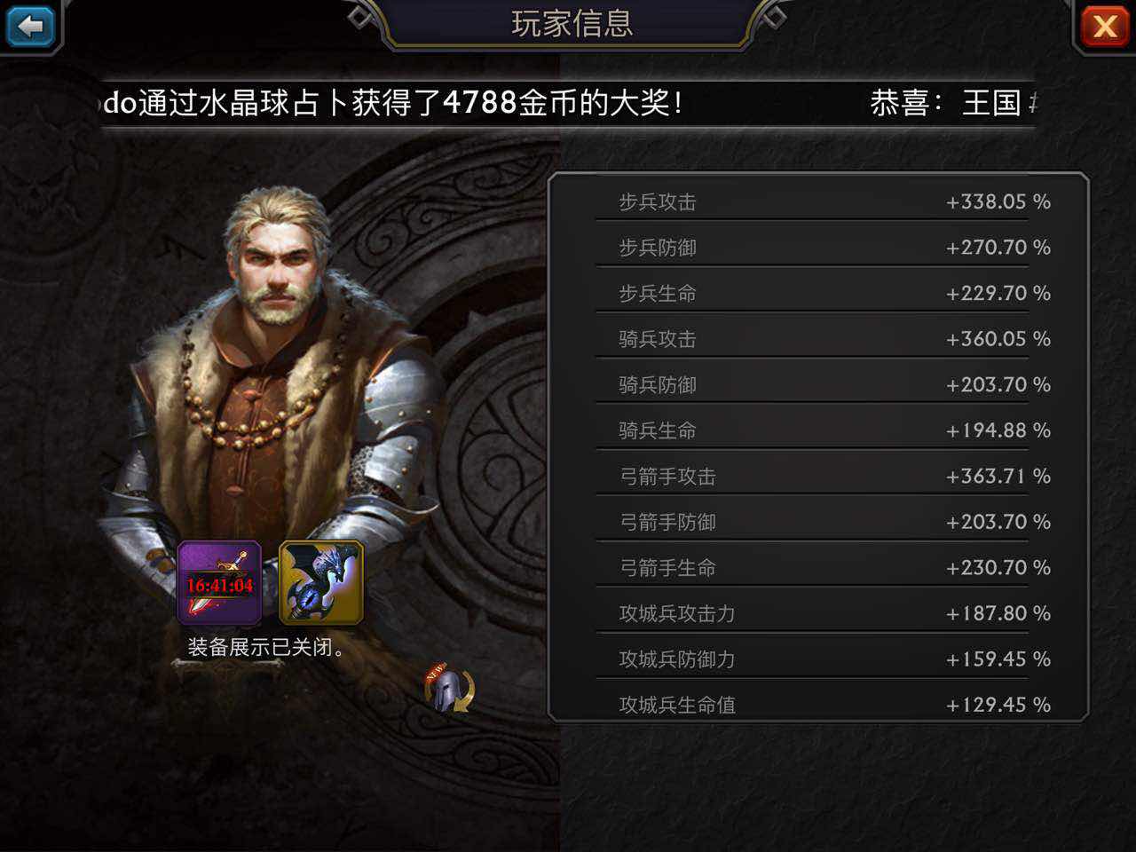 他實在沒時間玩了,曾經帶領我們和鬼子對抗,前兩次王戰失敗,現在已兩屆國王在我們華人手中,並且侵佔了一個王國,神器好幾件,黑龍斗篷錘子糧倉盾。。國王現在已換人了,一個盟的